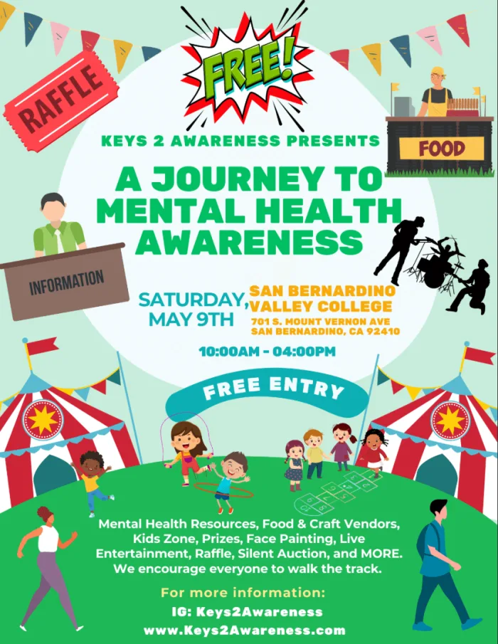 Keys 2 Awareness brings awareness to mental health through connecting people and organizations to various resources… providing the Keys 2 Awareness in a shameless environment. We are hosting our third Mental Health “Walk/Fair” on Saturday, May 9th at San Bernardino Valley College. For more information on this FREE event, CLICK HERE