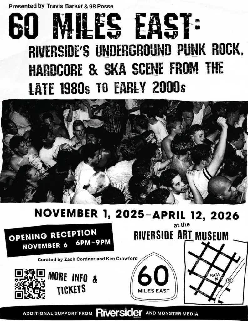 Don’t miss “60 Miles East: Riverside’s Underground Punk Rock, Hardcore & Ska Scene, from the late 1980s to early 2000s” – this exhibit is a celebration of the Punk, Ska, and Hardcore music scenes in Riverside. ON VIEW thru April 12th, 2026  Location: Art Alliance Gallery at the Riverside Art Museum Click HERE for tickets and more info