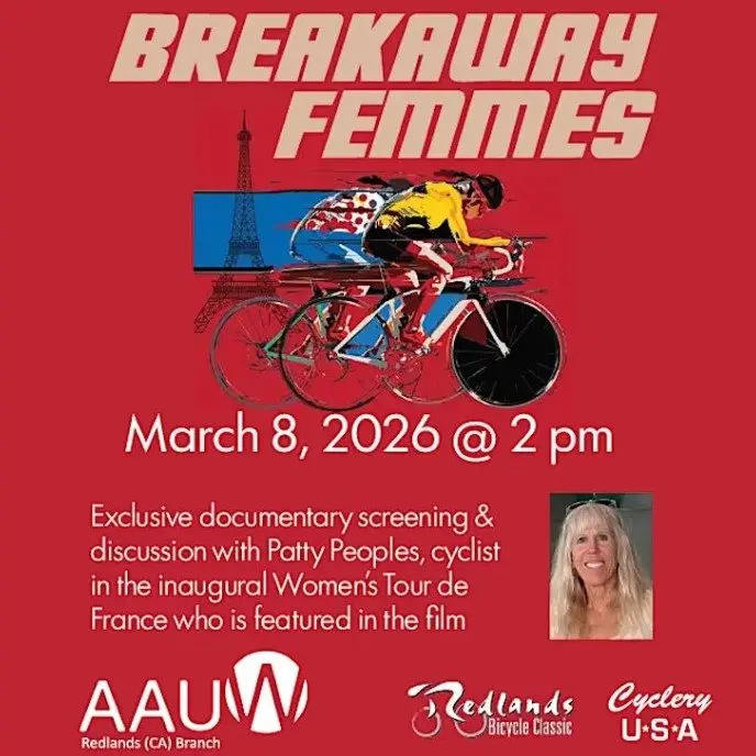 Breakaway Femmes, a powerful documentary celebrating the pioneering women of professional cycling in the Tour de France, will be screened at Crafton Hills College. American Association of University Women Redlands brings this inspiring film to our community with support from the Redlands Bicycle Classic and Cyclery USA. Tickets are $20 general admission, $15 Students. All proceeds go to the AAUW Redlands mission fund to advance equity for women and girls through education, empowerment, and advocacy, including scholarships, STEM education programs, and leadership training. CLICK HERE FOR TICKETS
