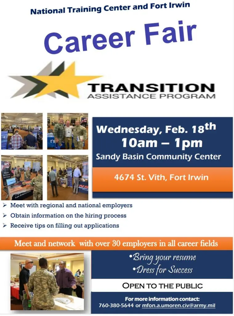 The Fort Irwin Transition Assistance Program is hosting an in-person career fair on February 18th. The event is free and open to the public. Come early (by 8am) to get a gate pass from the Visitor Information Center. Remember to bring resume, driver’s license, proof of insurance and car registration. For more information, call 760-380-5644