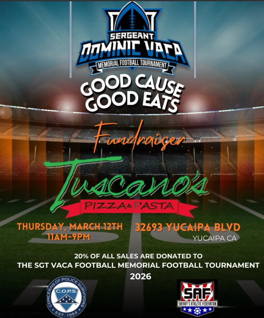 Southern California Concerns of Police Survivors (C.O.P.S.) provides resources to assist in the rebuilding of the lives of surviving families of law enforcement officers killed in the line-of-duty. You can support the cause, Thursday, March 12th at Tuscano’s restaurant in Yucaipa.