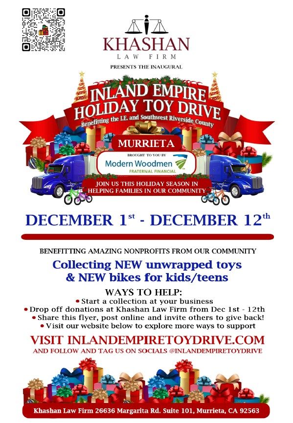 You are invited to participate in the Inland Empire Toy Drive! Donate a new, unwrapped toy or new bike for kids and teens. Donations can be dropped off at Khashan Law Firm in Murrieta during the 12 Days of Christmas. All proceeds directly benefit families and children through our nonprofit partners across Riverside County. For all the details, including drop off location and times: CLICK HERE To start a collection at your business: CLICK HERE