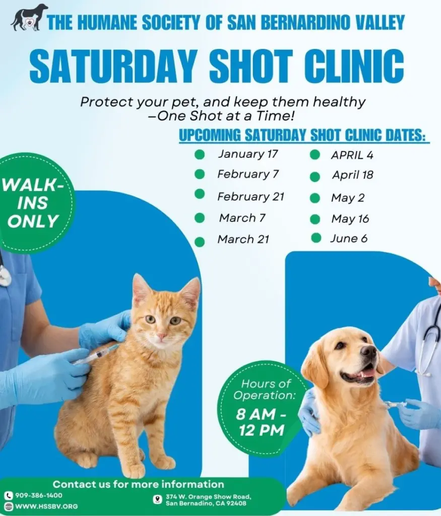 The Humane Society of San Bernardino Valley offers low cost veterinary services to the community, including low cost vaccines, vet exam, basic wellness, and spay and neuter surgery. All services are available Monday – Friday by appointment. The HSSBV also offers a walk in only (no appointment needed) vaccine clinic on the first and third Saturday of each month. For more information, visit their website at hssbv.org or call 909-386-1400