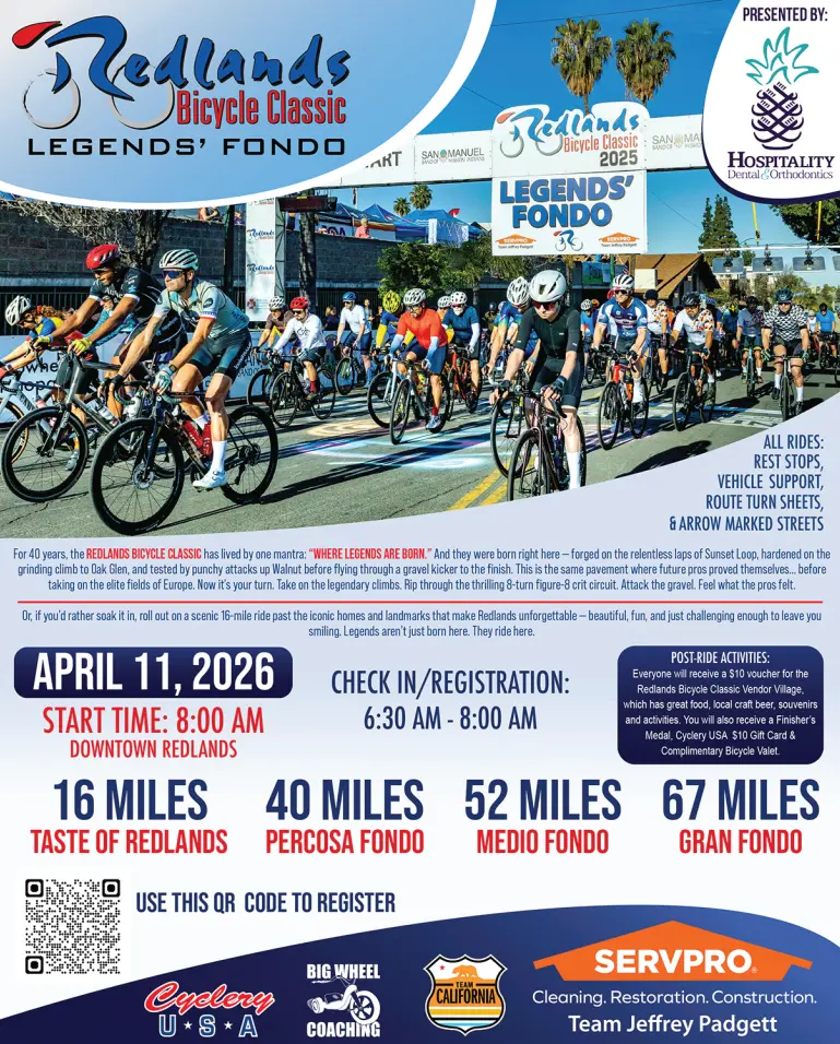You don’t have to be a professional racer to participate in the 2026 Redlands Bicycle Classic! Sign up for the Legends’ Fondo – with routes for recreation riders of all abilities – on Saturday, April 11th. To register CLICK HERE