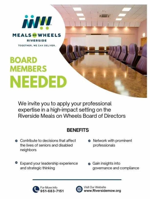 Are you interested in joining a Nonprofit Board? At Riverside Meals on Wheels, we are tackling two major issues: 1) Providing home-delivered nutrition to seniors and disabled neighbors, and 2) Combating a growing epidemic of isolation and loneliness in senior communities. The seniors we serve are parents, grandparents, veterans, former educators, and much more. Full of experience and wisdom, they deserve to age with dignity, respect, and independence. Join our board to serve senior wellness in our community. To apply: CLICK HERE