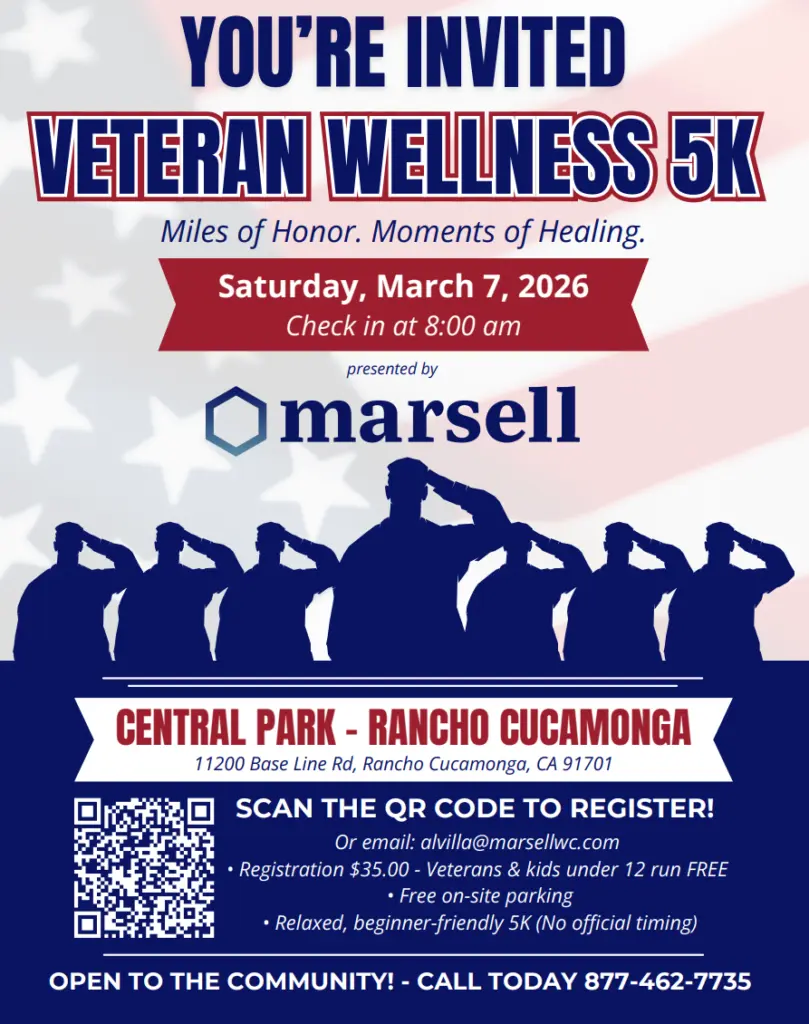 The Veterans Wellness 5K and Resource Fair is happening at Central Park in Rancho Cucamonga, Saturday, March 7th. The Veterans Honor 5K Run is more than just a run—it’s a tribute. Together, we walk to honor the courage and sacrifice of our Military Veterans. Whether you’re running, walking in memory of someone, or cheering from the sidelines, your participation helps honor those who have served our country. All Veterans and Active Duty Service Members run for FREE! Click HERE to register.